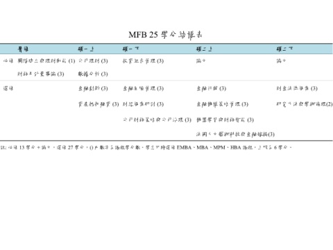 資產抵押融資 (3) 財經個案研討 (3) 金融機構策略管理 (3) 研究方法與學術倫理(2)