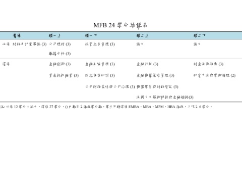 註: 必修 12 學分 + 論文,選修 27 學分,() 內數字為課程學分數。學生可跨選修 EMBA、MBA、MPM、HBA 課程,上限為 6 學分。