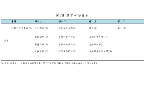 MFB 18 學分結構表 暑修 碩一上 碩一下 碩二上 碩二下 財務及計量導論 (3) 公司理財 (3) 投資組合管理 (3) 論文 (2) 論文 (2) 金融創新 (3) 金融投資分析 (3) 金融危機專題 (3) 選修 數據分析 (3) 金融風險管理 (3) 金融行銷 (3) 金融科技 (3) 財經個案研討 (3) 金融機構策略管理 (3) 註: 選修 39 學分,() 內數字為課程學分數。學生可跨選修 EMBA、MBA、MPM 課程,上限為 6 學分。