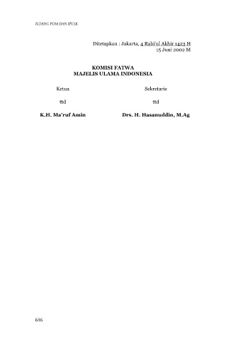 BIDANG POM DAN IPTEK Ditetapkan : Jakarta, 4 Rabi’ul Akhir 1423 H 15 Juni 2002 M KOMISI FATWA MAJELIS ULAMA INDONESIA Ketua Sekretaris ttd ttd K.H. Ma’ruf Amin Drs. H. Hasanuddin, M.Ag