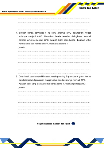 4.  Sebuah  benda  bermassa  5  kg  suhu  awalnya  27ºC  dipanaskan  hingga