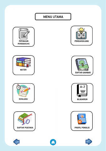 MENU UTAMA PETUNJUK PENDAHULUAN PENGGUNAAN MATERI DAFTAR GAMBAR EVALUASI GLOSARIUM DAFTAR PUSTAKA PROFIL PENULIS