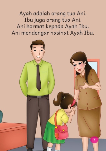 Ayah adalah orang tua Ani. Ibu juga orang tua Ani. Ani hormat kepada Ayah Ibu. Ani mendengar nasihat Ayah Ibu. 7