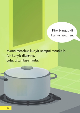 Fira tunggu di kamar saja, ya. Mama merebus kunyit sampai mendidih. Air kunyit disaring. Lalu, ditambah madu. 14