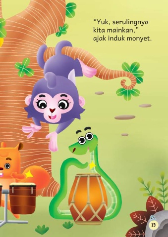 “Yuk, serulingnya kita mainkan,” ajak induk monyet. 13