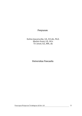 Penyusun: Rafrini Amyulianthy, S.E., M.S.Ak., Ph.D. Khalida Utami, S.E., M.Sc Tri Astuti, S.E., MM., Ak Universitas Pancasila Penerapan Pelaporan Terintegrasi di Rev. 4.0 ii