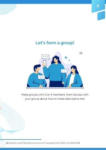 8 Let's form a group! [8] Make groups with 2 or 3 members, then discuss with your group about how to make descriptive text [8] kawalan studio https://www.canva.com/. Accessed 5 April 2023. time 05.55 WIB