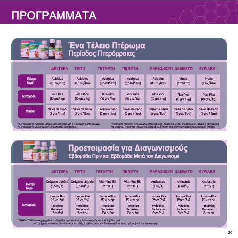 *Το νερό με το Acidplus μπορεί να διατηρηθεί για 3-4 ημέρες χωρίς αλλαγή. *Χορηγήστε 10 ml/kg από το Λάδι Πτερόρροιας (Aceite de Muda) σε σπόρους, μείγμα ή αυγοτροφή.