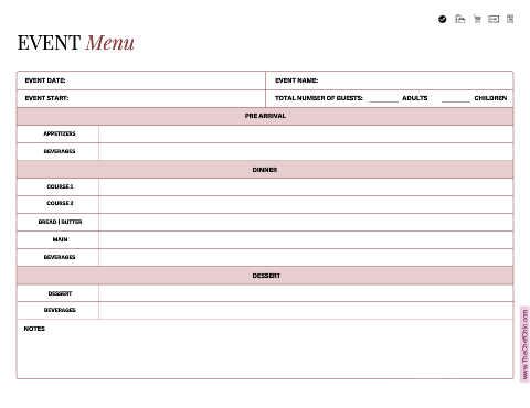 EVENT ]áğœ EVENT DATE: EVENT NAME: EVENT START: TOTAL NUMBER OF GUESTS: ADULTS CHILDREN PRE ARRIVAL APPETIZERS BEVERAGES DINNER COURSE 1 COURSE 2 BREAD | BUTTER MAIN BEVERAGES DESSERT DESSERT BEVERAGES õõõƣa© ©£ ©¬ƣËÄ NOTES