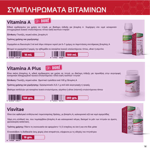 Ειδικά σχεδιασμένο για χρήση σε πτηνά, με ιδιαίτερη ένδειξη για βιταμίνη Α. Χορήγηση στο νερό καναρινιών