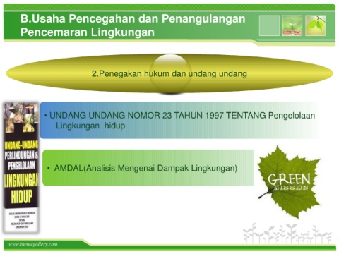 B.Usaha Pencegahan dan Penangulangan Pencemaran Lingkungan 2.Penegakan hukum dan undang undang • UNDANG UNDANG NOMOR 23 TAHUN 1997 TENTANG Pengelolaan Lingkungan hidup • AMDAL(Analisis Mengenai Dampak Lingkungan) www.themegallery.com