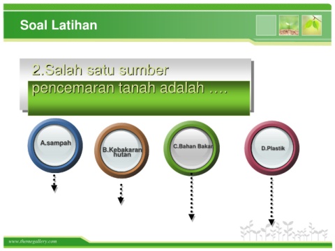Soal Latihan 2.Salah satu sumber pencemaran tanah adalah …. A.sampah B.Kebakaran C.Bahan Bakar D.Plastik hutan www.themegallery.com