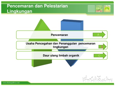 Pencemaran dan Pelestarian Lingkungan Pencemaran A Usaha Pencegahan dan Penanggulan pencemaran lingkungan B Daur ulang limbah organik C www.themegallery.com