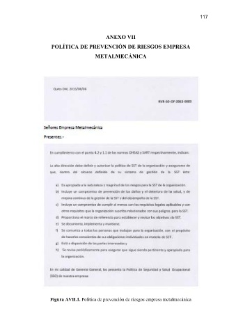 117 ANEXO VII POLÍTICA DE PREVENCIÓN DE RIESGOS EMPRESA METALMECÁNICA Figura AVII.1. Política de prevención de riesgos empresa metalmecánica