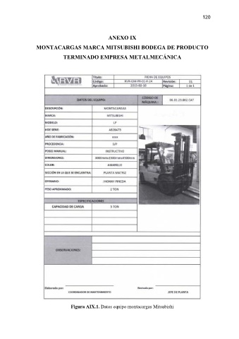 120 ANEXO IX MONTACARGAS MARCA MITSUBISHI BODEGA DE PRODUCTO TERMINADO EMPRESA METALMECÁNICA Figura AIX.1. Datos equipo montacargas Mitsubishi