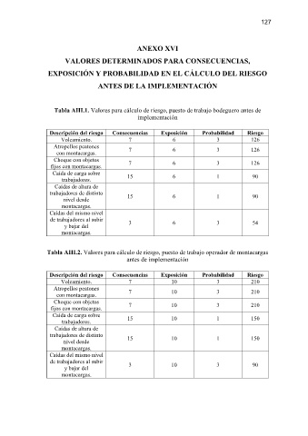 Tabla AIII.1. Valores para cálculo de riesgo, puesto de trabajo bodeguero antes de