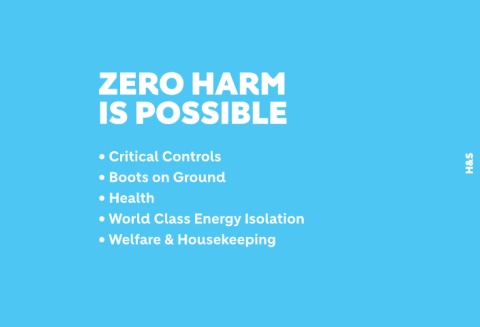 ZERO HARM IS POSSIBLE • Critical Controls H&S • Boots on Ground • Health • World Class Energy Isolation • Welfare & Housekeeping