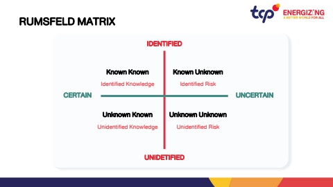 UNCERTAINIDENTIFIEDCERTAINUNIDETIFIEDKnown KnownIdentified KnowledgeKnown UnknownIdentified RiskUnknown KnownUnidentified Knowledge Unidentified RiskUnknown UnknownRUMSFELD MATRIX
