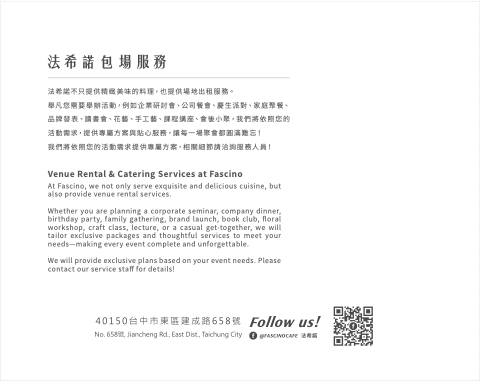 法希諾不只提 供精 緻 美味的料理,也提 供 場地出租 服務。