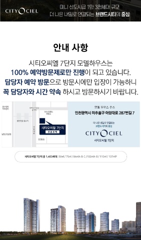 미니 신도시급 1만 3천세대 규모 더 나은 내일로 연결되는 브랜드시티의 중심 안내 사항 시티오씨엘 7단지 모델하우스는 100% 예약방문제로만 진행이 되고 있습니다. 담당자 예약 방문으로 방문시에만 입장이 가능하니 꼭 담당자와 시간 약속 하시고 방문하시기 바랍니다. 모델 하우스 주소 인천광역시 미추홀구 아암대로 287번길 7