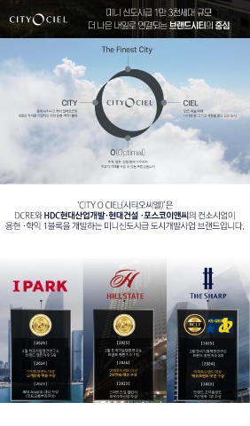 미니 신도시급 1만 3천세대 규모 더 나은 내일로 연결되는 브랜드시티의 중심 ‘CITY O CIEL(시티오씨엘) ’ 은 DCRE와 HDC현대산업개발·현대건설 ·포스코이앤씨의 컨소시엄이 용현 ·학익 1블록을 개발하는 미니신도시급 도시개발사업 브랜드입니다.
