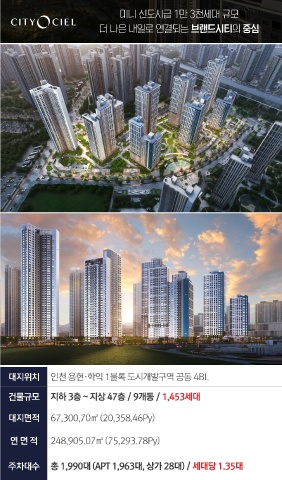 미니 신도시급 1만 3천세대 규모 더 나은 내일로 연결되는 브랜드시티의 중심 대지위치 인천 용현·학익 1블록 도시개발구역 공동 4BL 건물규모 지하 3층 ~ 지상 47층 / 9개동 / 1,453세대 대지면적 67,300,70㎡ (20,358.46Py) 연 면 적 248,905.07㎡ (75,293.78Py) 주차대수 총 1,990대 (APT 1,963대, 상가 28대) / 세대당 1.35대