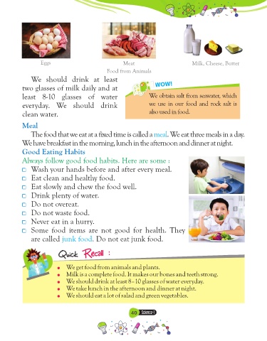 The food that we eat at a fixed time is called a meal             . We eat three meals in a day.
