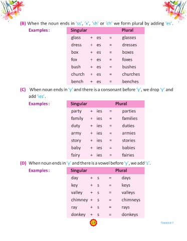 (B) When the noun ends in ‘ss’ ‘x’ ‘sh’ or ‘ch’ we form plural by adding ‘es’ .