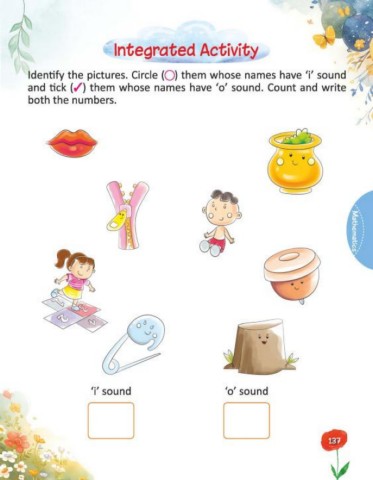 Integrated Activit~ . ~ Identify the pictures. Circle (0 ) them whose names have 'i' sound ~ and tick (~) them whose names have 'o' sound. Count and write ~ both the numbers. ~~ ~ 'i' sound 'o' sound