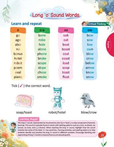 learning. This sound is typically found in words with spelling patterns such as o (no), oa (boat), ow :