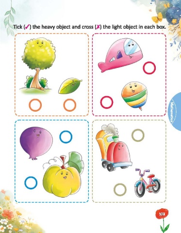 6 Tick (.I) the heavy object and cross (.K) the light object in each box.