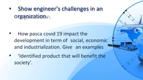 • Show engineer’s challenges in an organization. • How pasca covid 19 impact the development in term of social, economic and industrialization. Give an examples • ‘Identified product that will benefit the society’.