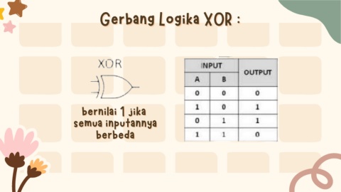 Gerbang Logika XOR : Gerbang Logika XOR : bernilai 1 jika bernilai 1 jika semua inputannya semua inputannya berbeda berbeda