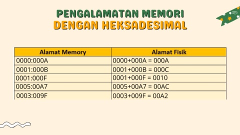 PENGALAMATAN MEMORI PENGALAMATAN MEMORI DENGAN HEKSADESIMAL DENGAN HEKSADESIMAL 0000:000A 0000+000A = 000A 0001:000B 0001+000B = 000C 0001:000F 0001+000F = 0010 0005:00A7 0005+00A7 = 00AC 0003:009F 0003+009F = 00A2