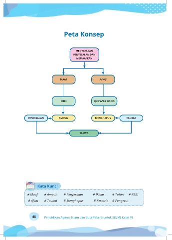 Peta Konsep Kata Kunci # Maaf # Ampun # Penyesalan # Ikhlas # Takwa # KBBI # Afwu # Taubat # Menghapus # Kesatria # Pengecut 48 Pendidikan Agama Islam dan Budi Pekerti untuk SD/MI Kelas VI