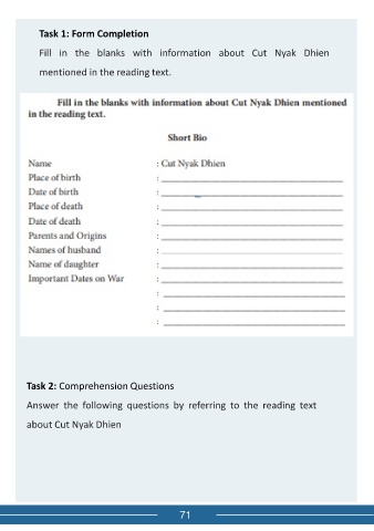 Task 1: Form Completion Fill in the blanks with information about Cut Nyak Dhien mentioned in the reading text. Task 2: Comprehension Questions Answer the following questions by referring to the reading text about Cut Nyak Dhien 71