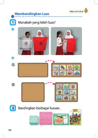 Membandingkan Luas Kelas1, Hal 7,23, 24 1 1 Manakah yang lebih luas? ➊ Ⓐ Ⓑ ➋ Ⓐ Ⓑ 2 2 Bandingkan berbagai luasan. 126