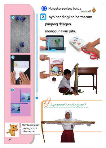 Kelas1, Hal 7 2 2 ➊ Ayo bandingkan bermacam panjang dengan menggunakan pita. ➋ ➌ Aktifitas Ayo membandingkan? Membandingkan panjang ada di halaman 119. 120