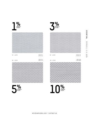 1 3 % ESSENTIAL % OPENNESS OPENNESS FACTOR FACTOR 98 - 118 IN 3001 98 - 118 IN 3003 SCREEN 1-3-5-10% 98 - 118 IN 3005 98 - 118 IN 3010 5 % 1 0 % OPENNESS OPENNESS FACTOR FACTOR windowmodes.com | contact us