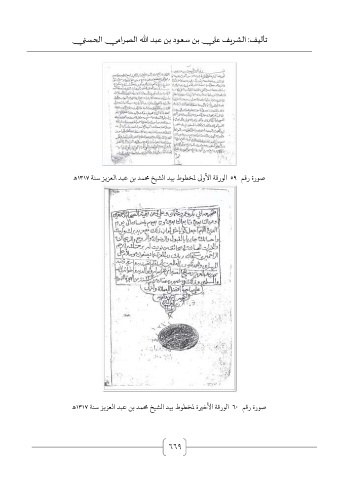 تأليف :الشريف علي بن سعود بن عبد الله الصرامي الحسني صورة رقم 59الورقة الأولى لمخطوط بيد الشيخ محمد بن عبد العزيز سنة 1317ه صورة رقم 60الورقة الأخيرة لمخطوط بيد الشيخ محمد بن عبد العزيز سنة 1317ه 669