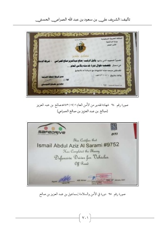 تأليف :الشريف علي بن سعود بن عبد الله الصرامي الحسني صورة رقم 94شهادة تقدير من الأمن العام 1430/07/01ـهصالح بن عبد العزيز (صال بن عبد الع ي بن صال الصرام ) صورة رقم 95دورة في الأمن والسلمة إسماعيل بن عبد العزيز بن صالح 701