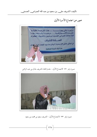 تأليف :الشريف علي بن سعود بن عبد الله الصرامي الحسني صور من اجتماع الأسرة الأول صورة رقم 132الاجتماع الأول – مقدم اللقاء الشريف ًعدل بن عبد الرحمن صورة رقم 133الاجتماع الأول – الشريف سعود بن محمد بن سعود 725