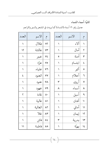 جدول رقم 16أسماء (النساء) كما وردت في المشجر والسير والتراجم