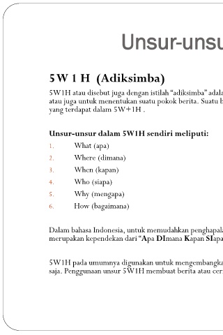 5W1H atau disebut juga dengan istilah “adiksimba” adalah unsur yang digunakan untuk memahami inti sebuah berita