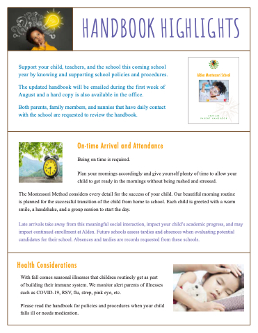 Both parents, family members, and nannies that have daily contact with the school are requested to review the handbook.