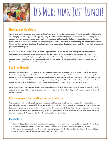 We recognize that parents are busy, and some may not feel as strongly as we do about lunch items. You chose our school for the many wonderful things we teach your children. This is one of those things. Please support your teachers by planning lunches within our parameters. It causes stress between the children when some may bring goodies and others do not. Items not fitting within our parameters will be sent home with a note and a healthier item may replace it. Please see the Parent Handbook for more details.