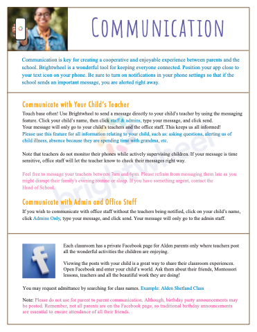Communication is key for creating a cooperative and enjoyable experience between parents and the school. Brightwheel is a wonderful tool for keeping everyone connected. Position your app close to your text icon on your phone. Be sure to turn on notifications in your phone settings so that if the school sends an important message, you are alerted right away.