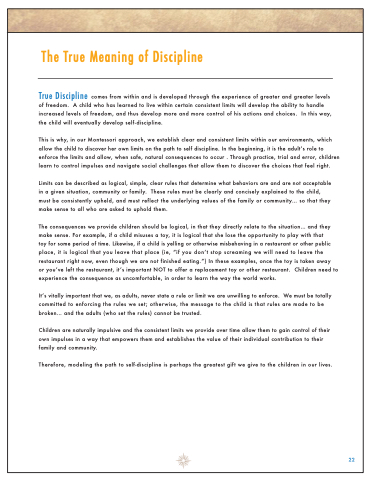 True Discipline comes from within and is developed through the experience of greater and greater levels of freedom. A child who has learned to live within certain consistent limits will develop the ability to handle increased levels of freedom, and thus develop more and more control of his actions and choices. In this way, the child will eventually develop self-discipline.