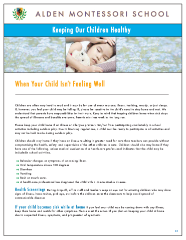 Please keep your child home if an illness or allergies prevents him/her from participating comfortably in school activities including outdoor play. Due to licensing regulations, a child must be ready to participate in all activities and may not be held inside during outdoor play.