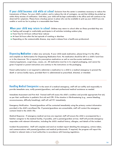 If your child becomes sick while at school Exclusion from the center is sometimes necessary to reduce the transmission of illness. For your child's comfort, and to reduce the risk of contagion, we ask that children be picked up within thirty minutes of notification. Until then, your child will be kept comfortable in the office and will continue to be observed for symptoms. Please have a backup person in place who can be available to pick up your child if you are unable or work too far to pickup in a reasonable time frame.